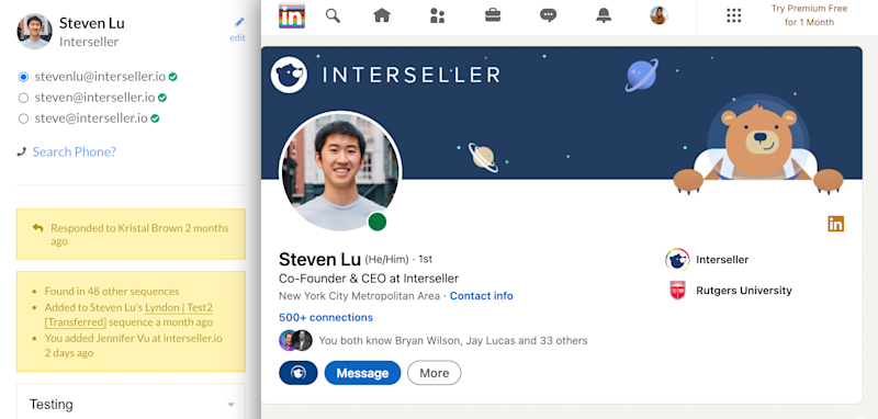 Our Chrome extension can help find contacts' work and personal emails, easily personalize messages, and sync them to sequences and connected integrations.